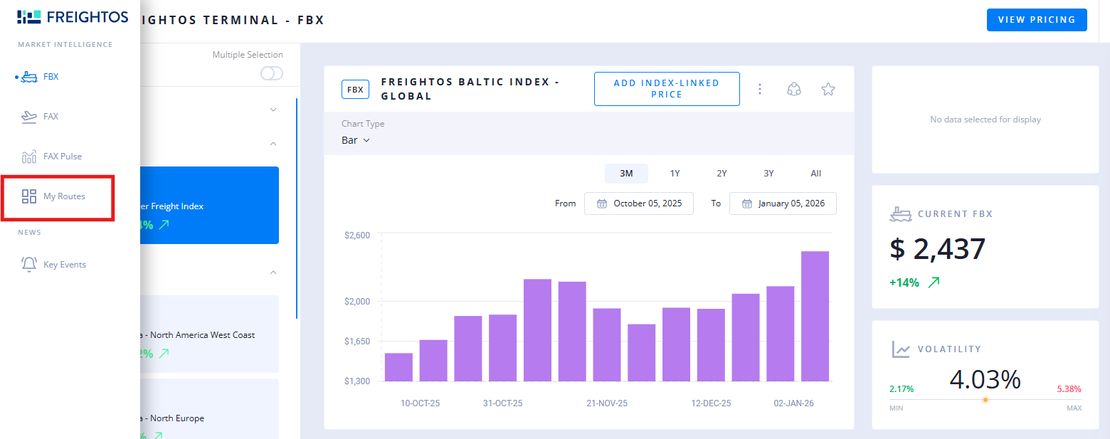 “My Routes” lets you save and track the exact ocean and air routes you care about - port to port and airport to airport - with daily rates, transit times, and lane‑level updates in one place.