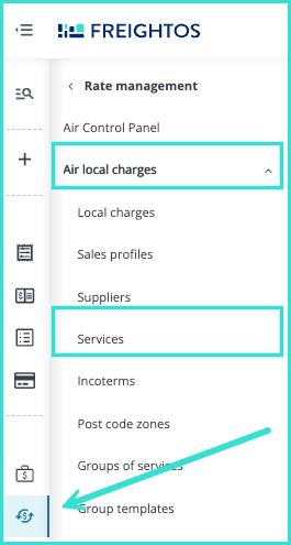 Firstly, create a service. To do this, open the side menu, click on Rate management, Local charges, and select Services from the dropdown.