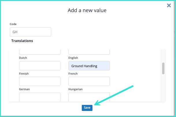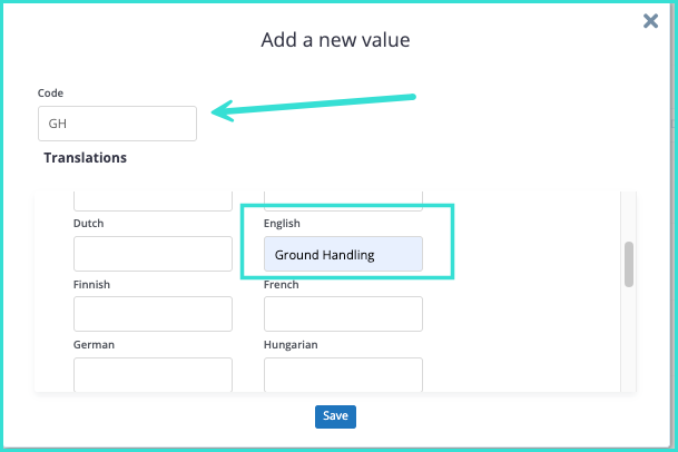 Next, you will need to create a code for your local charge service. A pop-up will appear with a blank section for Code along with sections where you can add the name of the code for different languages. The different languages are used in case you are quoting in different languages.