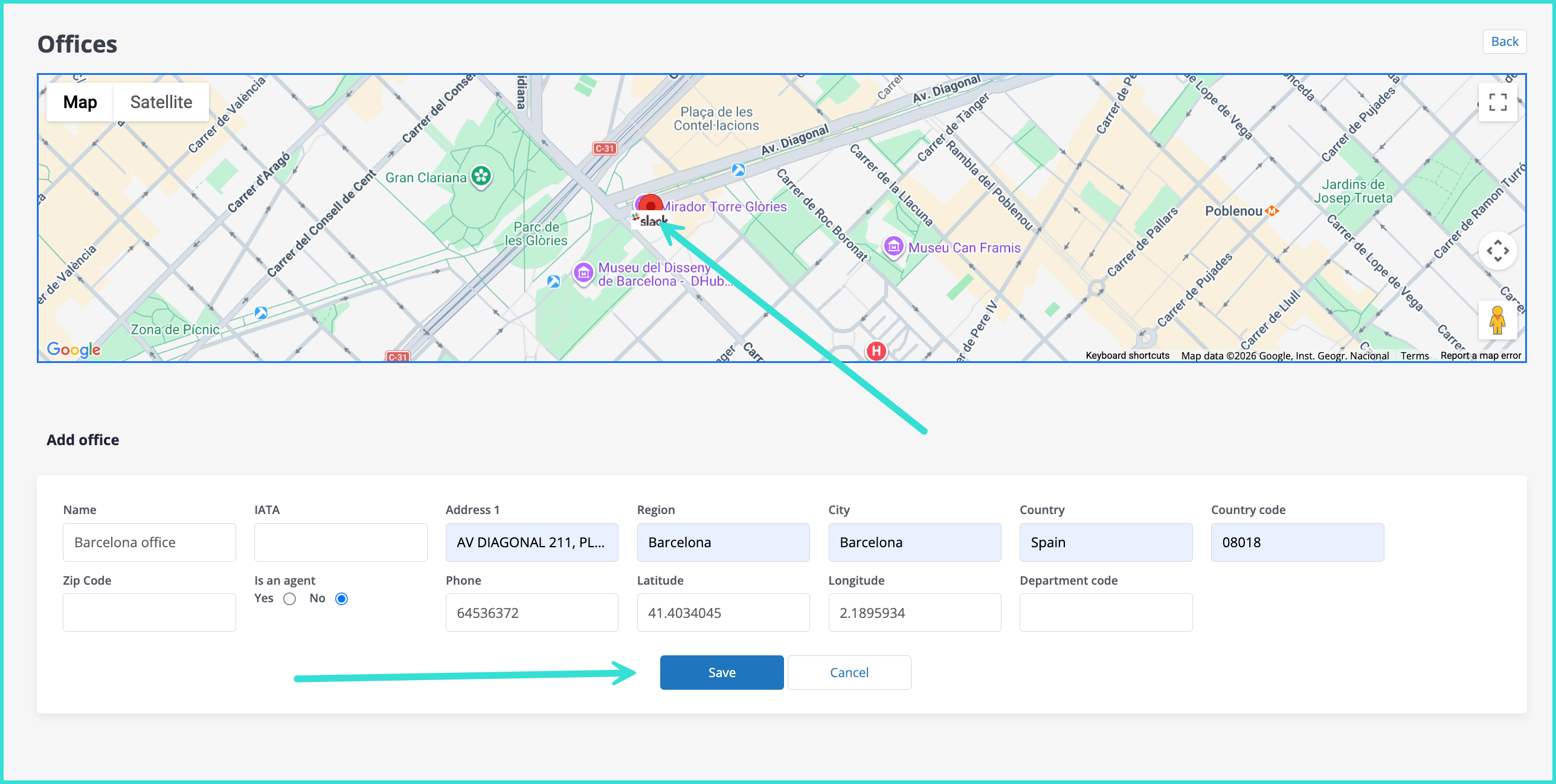An API connection to Google Maps helps you visualise the address you're adding. Within the form, you can enter the name of the office, the full address, and specify whether this office location is an agent. As you’re entering more information, the map will update to show you the exact location. The Latitude and Longitude sections will also update based on the information you have entered.
