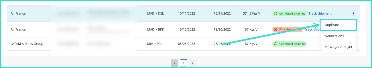 To do this, open the side menu, click on eBookings under the Shipment section then click on Air eBookings. Find an eBooking you want to duplicate. On the right-hand side of the eBooking, you’ll see three horizontal dots. Click on these dots, and select Duplicate.