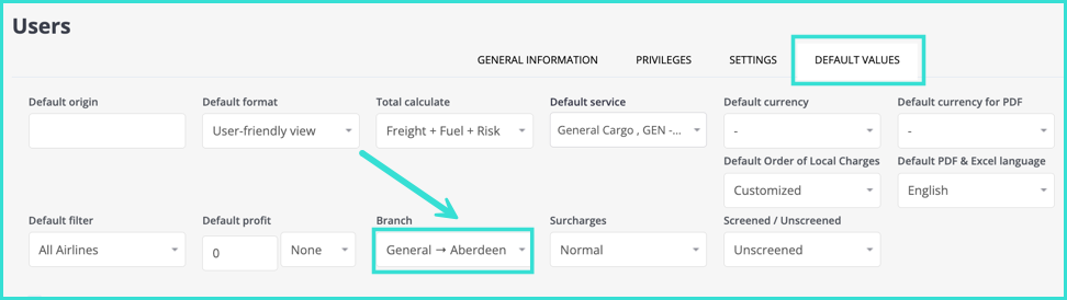 You’re able to select a default branch for any user to show which one is used most often when they are searching or making a quote. From the list of tabs, which include General Information, Privileges, Settings & Default Values, head to Default Values. Then, click on the section called ‘Branch’ and select the branch you’d like to be the default option. Click Save to save your default branch options.