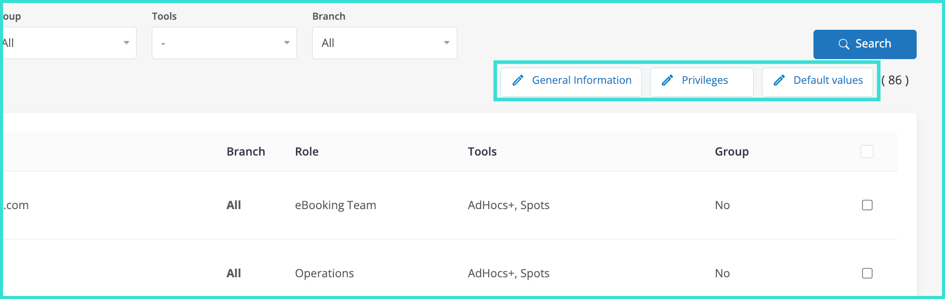 Within the General Information section, you can assign branches, local charge profiles, assign IATA codes and activate eBookings for all users in your company that are registered on WebCargo. In privileges, you can manage which tools all users have access to. Bear in mind that the tools shown will differ from pack to pack.