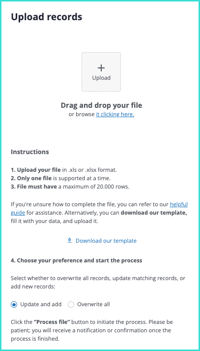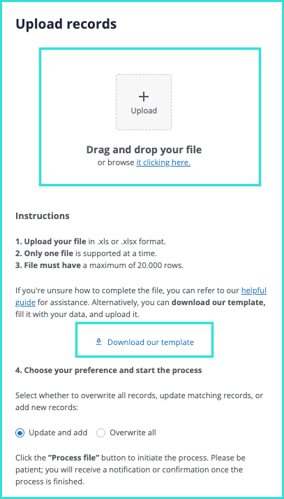 Below the file upload button, you’ll find a link to download the template with all the fields to correctly upload your client data.