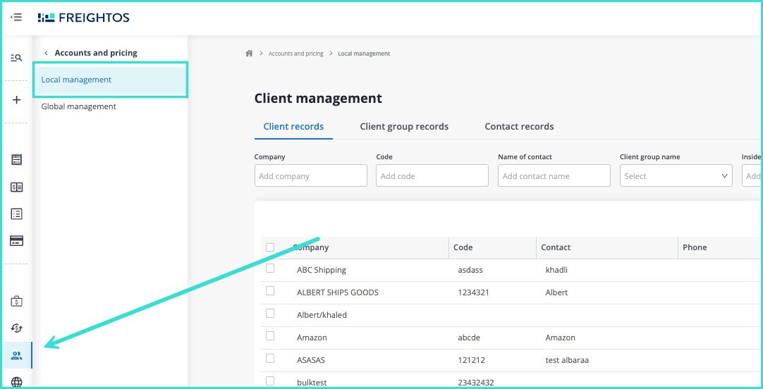 Using the multi-client upload tool, you can upload information for multiple clients at the same time using the XLSX file uploader. Firstly, open the side menu, select the Accounts and pricing section, then click on Local management from the dropdown.