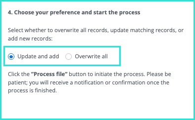 Next, choose whether you want to update existing client records, or completely overwrite all existing records.