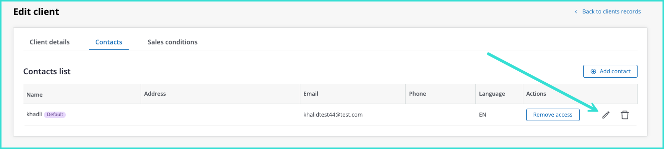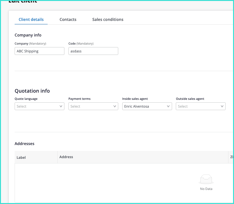 Your client information will then be visible in the Client management tool. Click on the corresponding client to view the Client details, contact information, and Sales Conditions within the separate tabs.