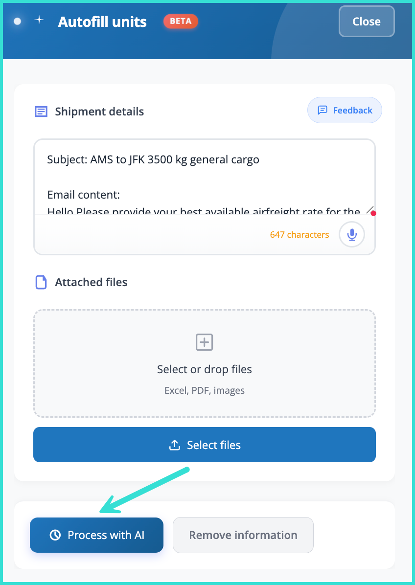 A section will appear where you can add your shipment details, and another to upload Excel, PDF, or images which will be analysed using artificial intelligence and then formatted within the search fields.