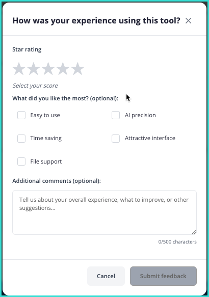 Within the form, you can select a star rating, choose what you liked about the tool, and add any additional comments for feedback, or improvements. Once you’ve entered your feedback, click on Submit feedback.