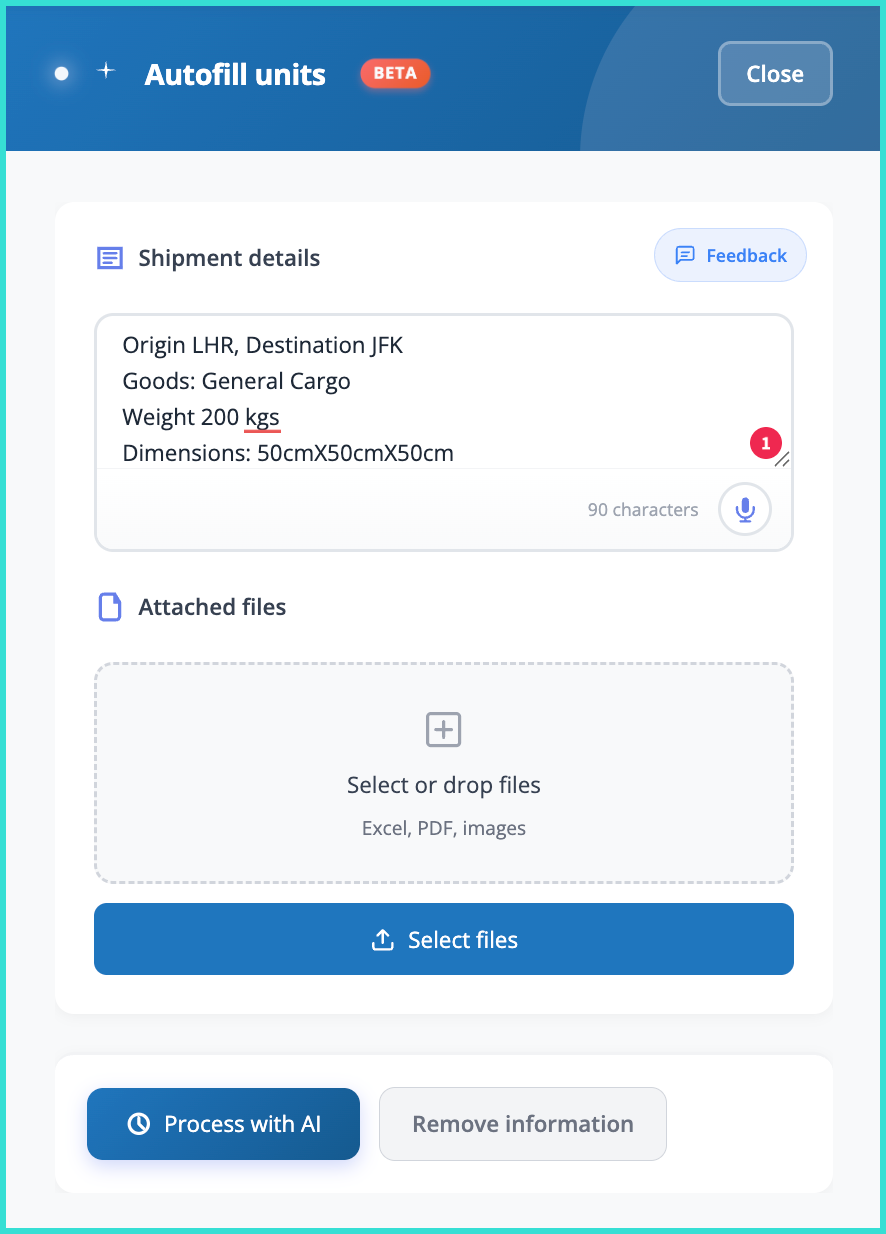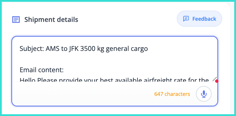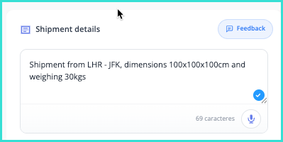 If you are manually entering your shipment details, simply enter the origin and destination airports and the weight and dimensions of your shipment. You can also copy and paste information if you have it externally, for example in an email, and add it to this box.