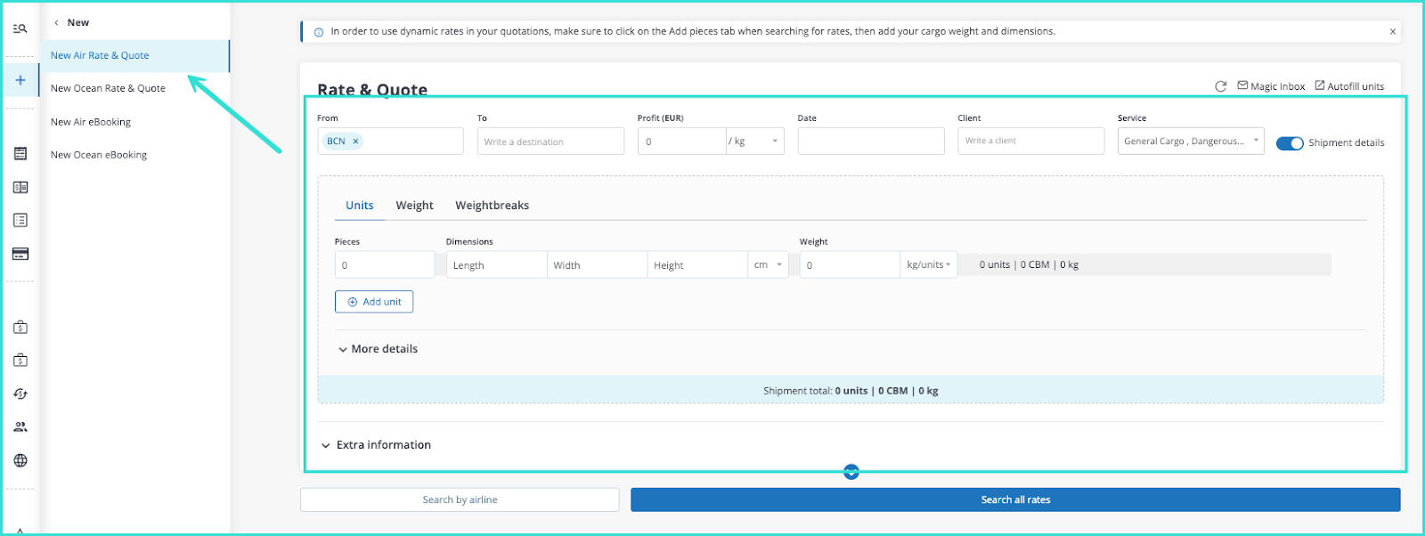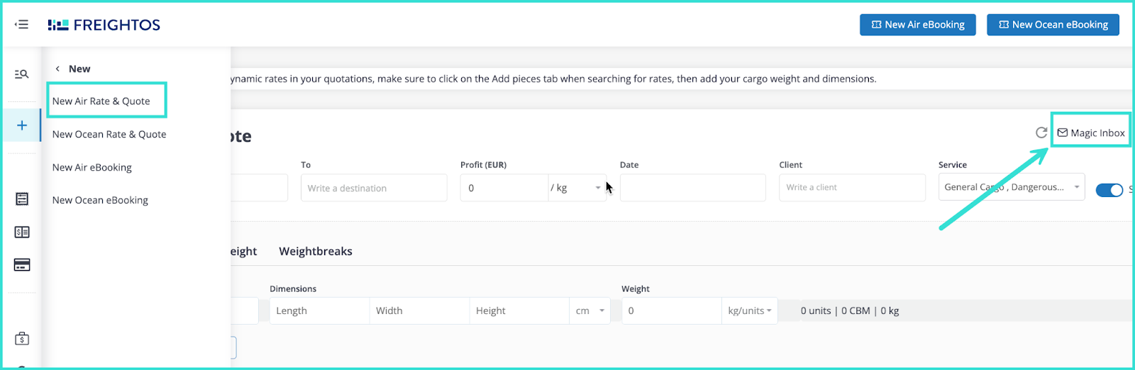 To use this magic inbox, firstly log into your account. You should automatically be sent to the quotation page, but if not, open the side menu, click on the “+” symbol and then select New Air Rate & Quote.