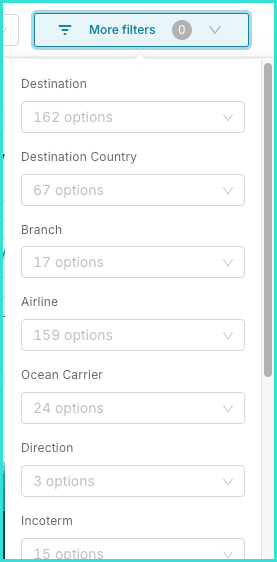 Additionally, you can select even more specific filters by expanding the More filters dropdown. Here you’ll find other filter options such as Destination, Airline, Ocean Carrier, Incoterm and more.