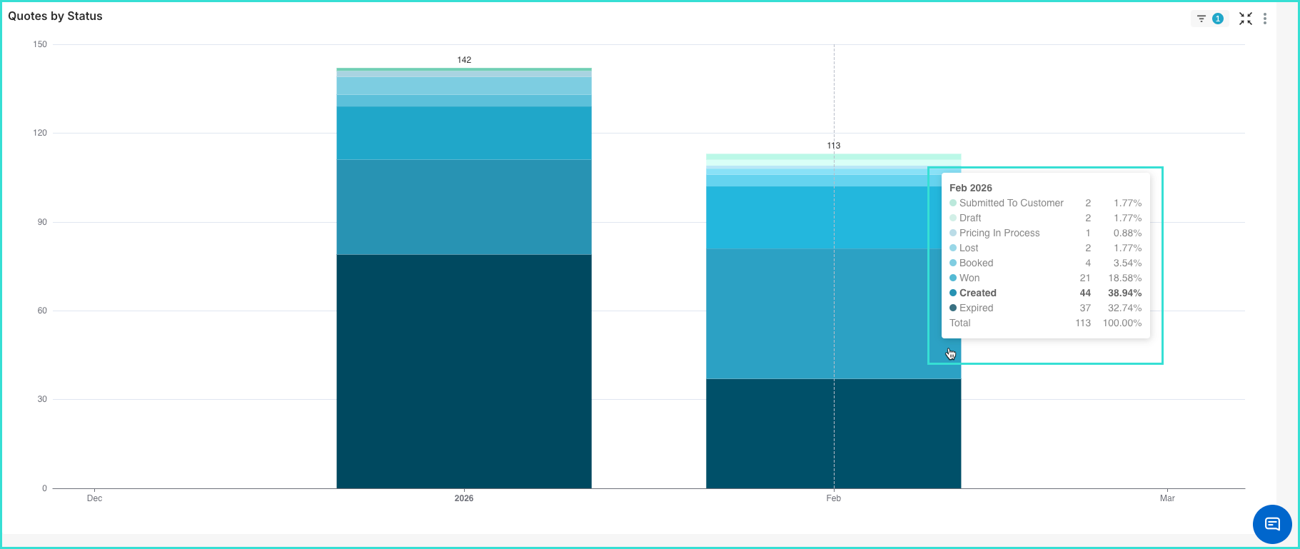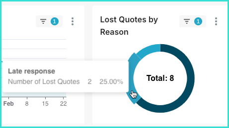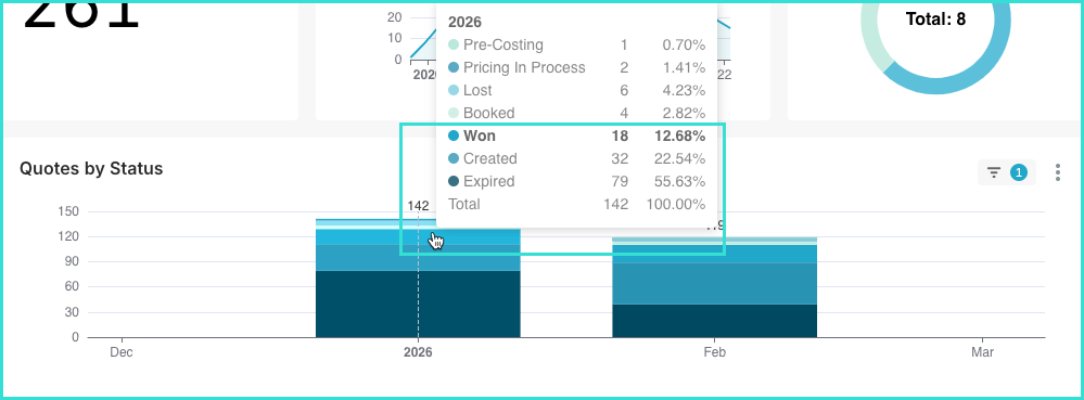 In addition to seeing more detailed information by moving your mouse over the chart, clicking on it will apply it as a filter. For example, when hovering over the Won section of this chart, clicking on it will apply the filter Status: Won to the rest of the dashboard.