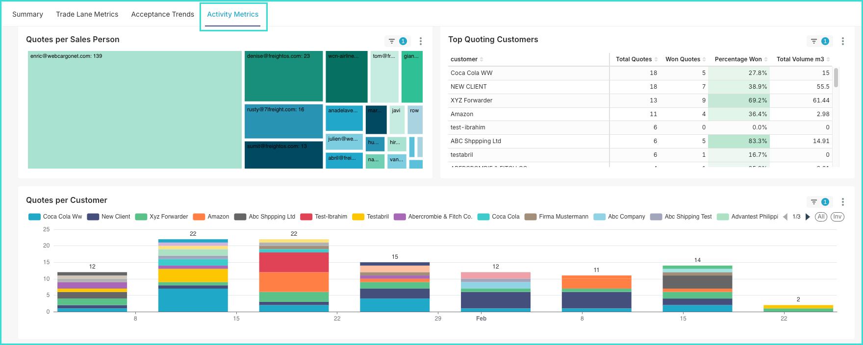 Finally, the Activity Metrics tab offers visibility into internal activity and customer engagement, supporting workload distribution analysis and monitoring customer performance. The data shown here includes quotes per sales person, per customer and top quoting customers.