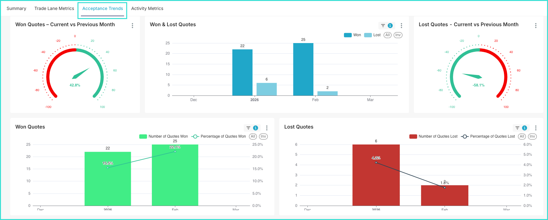 On the Acceptance Trends tab, you can Compare current and previous month performances in terms of won and lost quotes, enabling tracking of month-over-month performance.