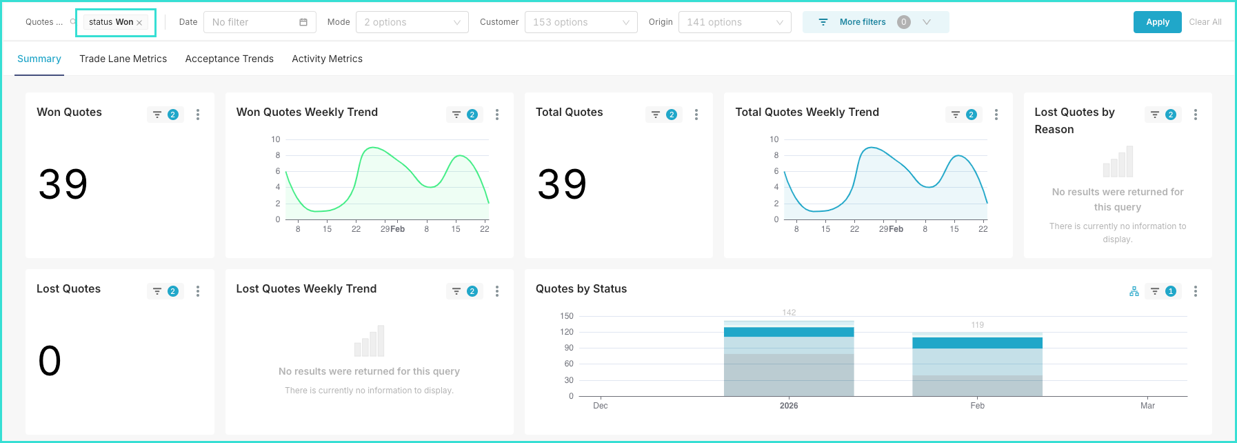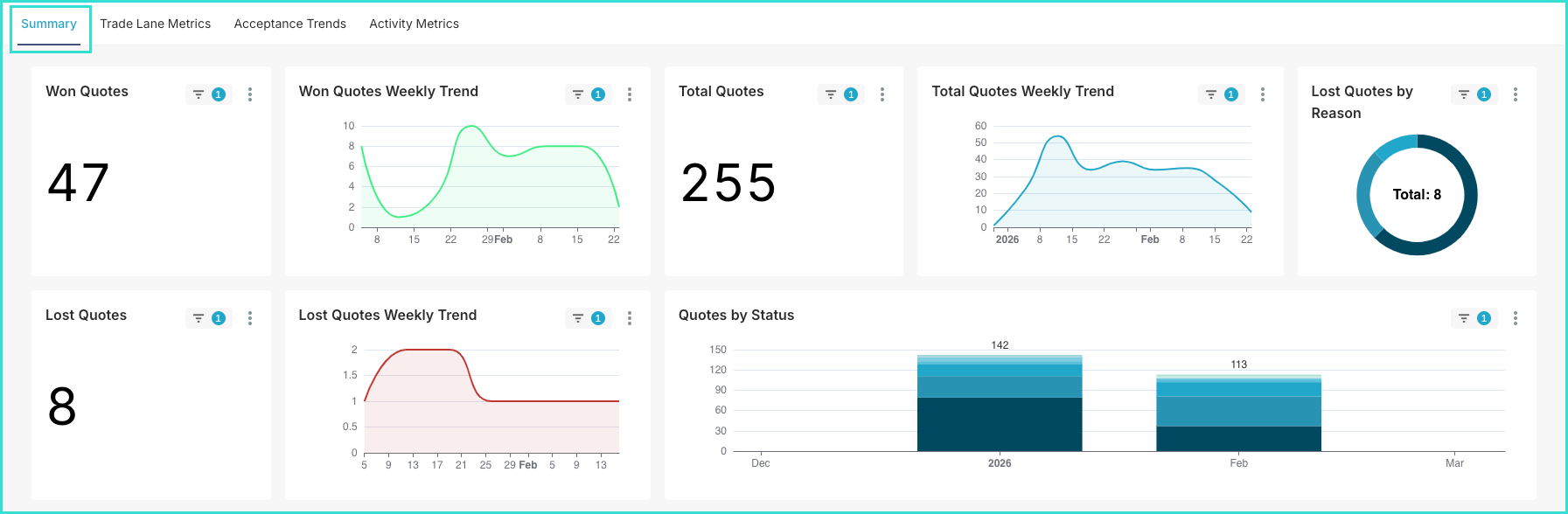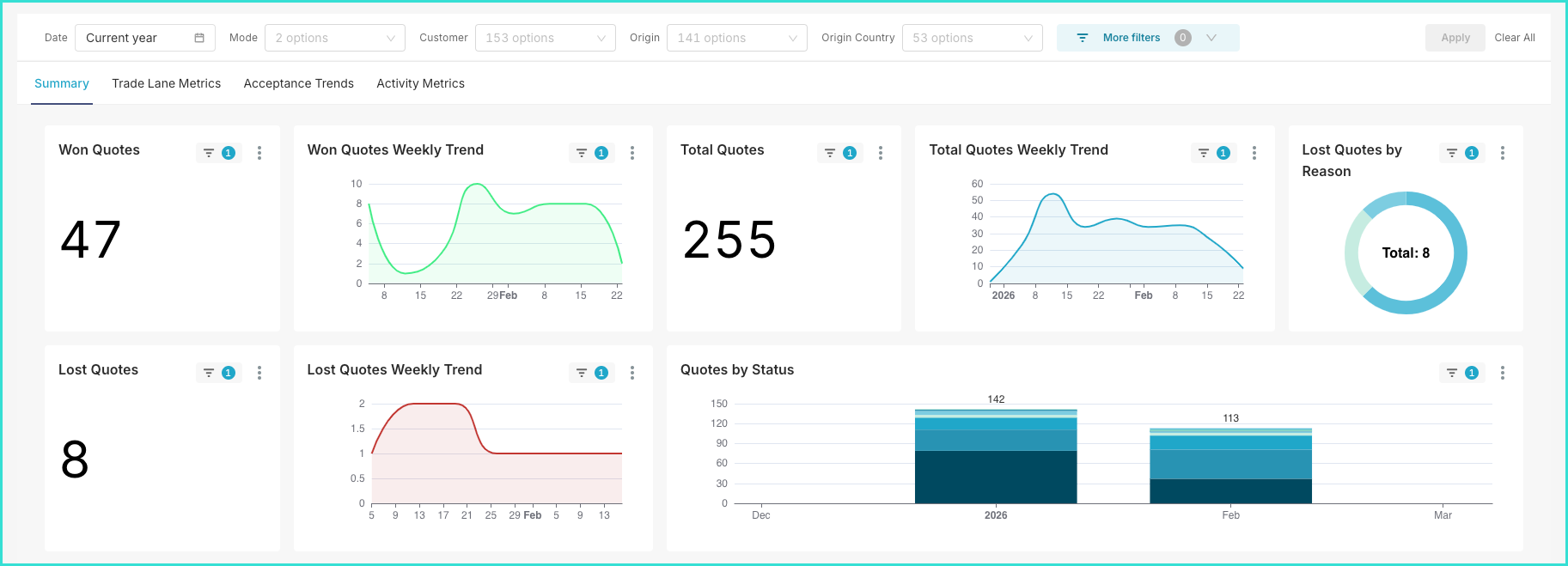 The first tab, Summary, offers a high-level overview of quotation performance, helping you evaluate overall pipeline health and track performance trends weekly.
