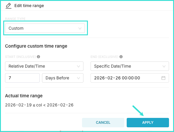 If you are looking for specific dates to filter by, select the Custom option under the Range type dropdown. Enter your specific dates and click Apply.