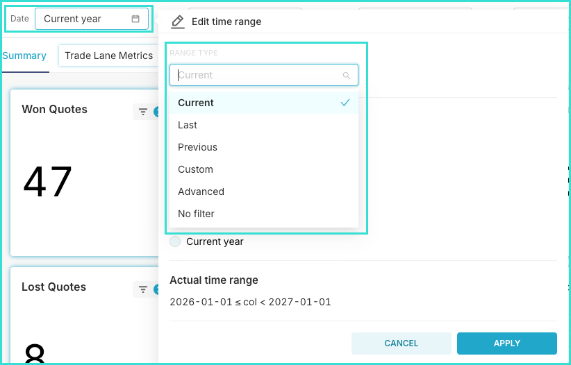 Start by selecting the date range for which you want to see analytics. First, pick a Range type from the dropdown, such as Current, Last, Previous, etc.