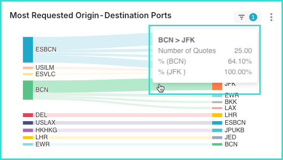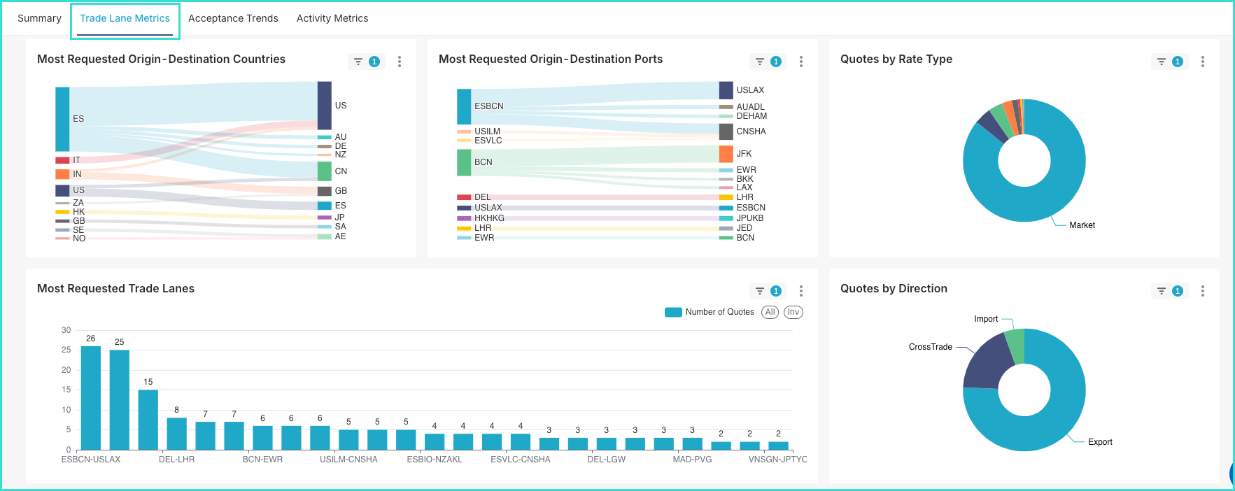 The second tab, Trade Lane Metrics, provides insights into commercial and routing trends, such as the most requested origin-destination countries and ports, most requested trade lanes and quotes by direction and rate type, assisting in identifying key markets and rate behaviors.